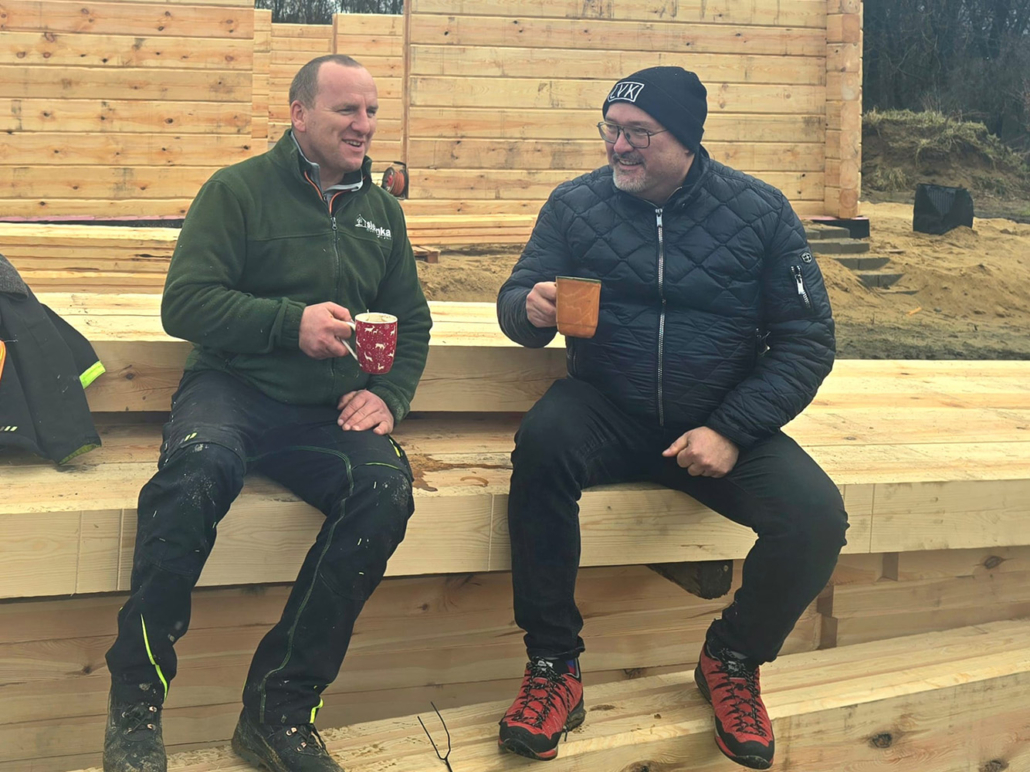 Do ulubionych chwil Zbyszka, który lubi odwiedzać budowy należy rytualne degustowanie kawy „plujki” (z fusami) z sielankową ekipą twardzioszków – na zdjęciu Rafcio. Oczywiście najpierw wnikliwe konsultacje i „burza mózgów”. 🤔🤯